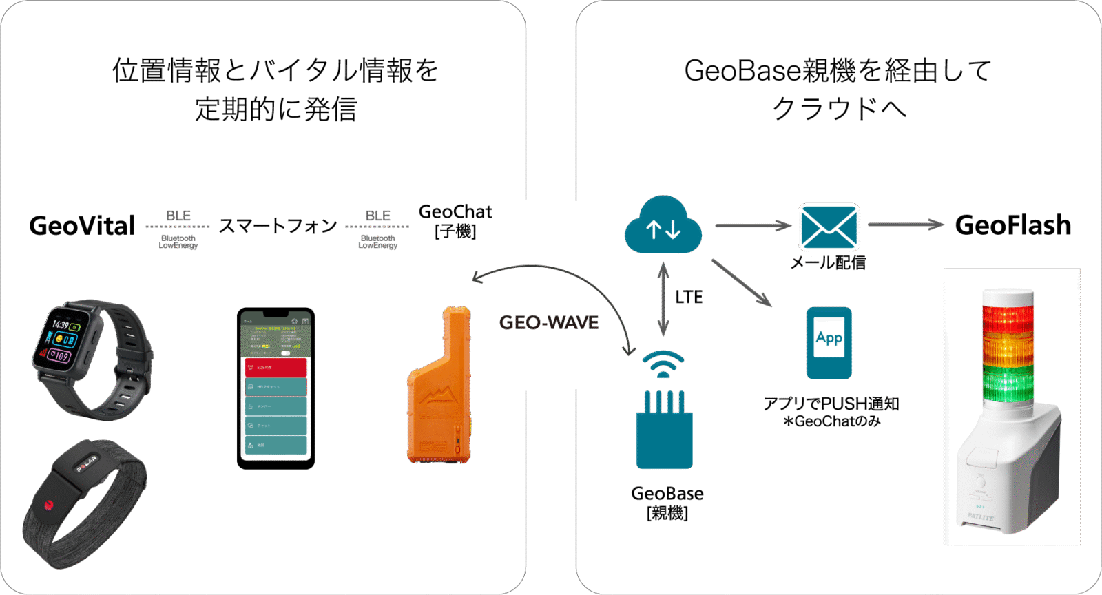 GeoChatを携帯している場合でも、急な事故や体調悪化によりSOSを発信できない場合や、SOSが発信された場合でも、現場から離れた事務所ではメール通知を見落としてしまうことが想定されます。そこで、オプション品のGeoVitalやGeoFlashと連携することで、重大な事故の見落としを防ぎ、早期対応に貢献します。